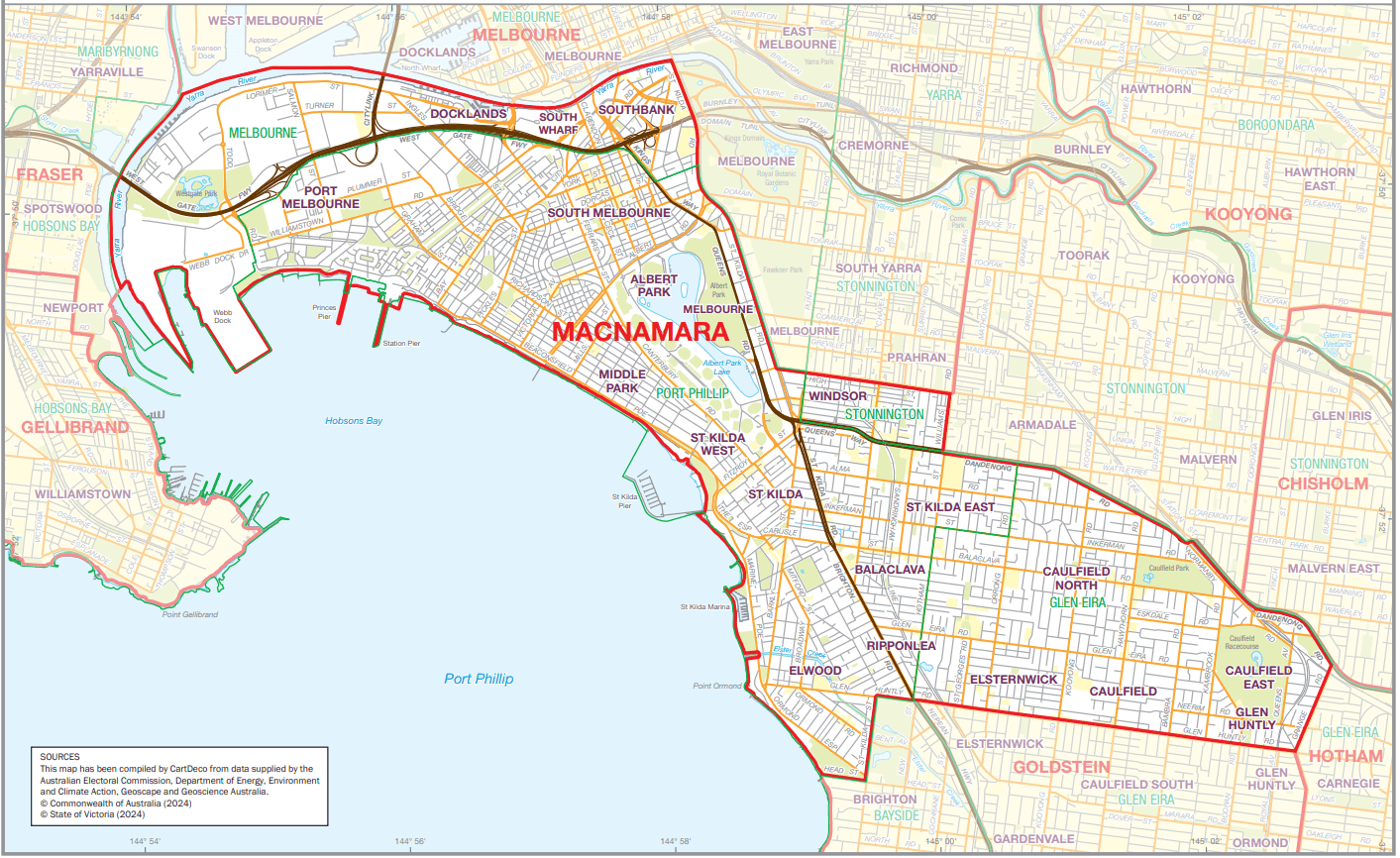 Macnamara is the name given to the federal electorate that covers the eastern shores of Port Phillip Bay and takes in the suburbs of Port Melbourne, Albert Park, Balaclava, Caulfield, Elwood, Middle Park, Ripponlea, Windsor, Southbank, South Melbourne and St Kilda, as well as parts of Glen Huntly and Elsternwick.